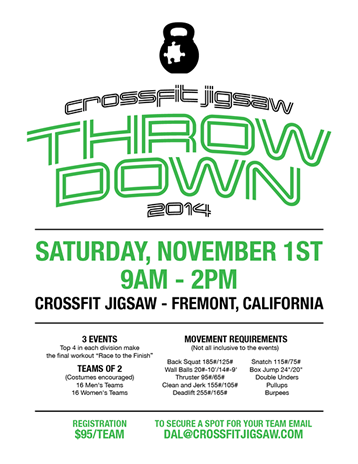 Read More: JigSaw Throw down (November 1, 2014)From Lyn Coronado -Spots will fill up fast! The 2nd Annual Jigsaw Throw Down is scheduled for Nov. 1st, check out the flyer for details and get registered now. From Dal at JigSaw: “It will be just like last year simple movements but challenging partner workouts. I still need help with volunteers and judges, it was…